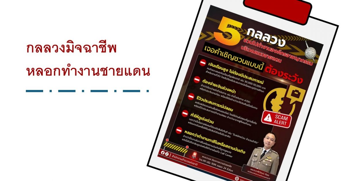 สำนักงานตำรวจแห่งชาติ จึงขอให้พี่น้องประชาชนระมัดระวังกลุ่มมิจฉาชีพที่หลอกลวงให้เดินทางไปทำงานในประเทศเพื่อนบ้าน เพราะท่านอาจถูกบังคับให้กระทำความผิดและตกเป็นเหยื่อของขบวนการค้ามนุษย์