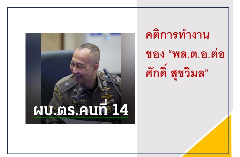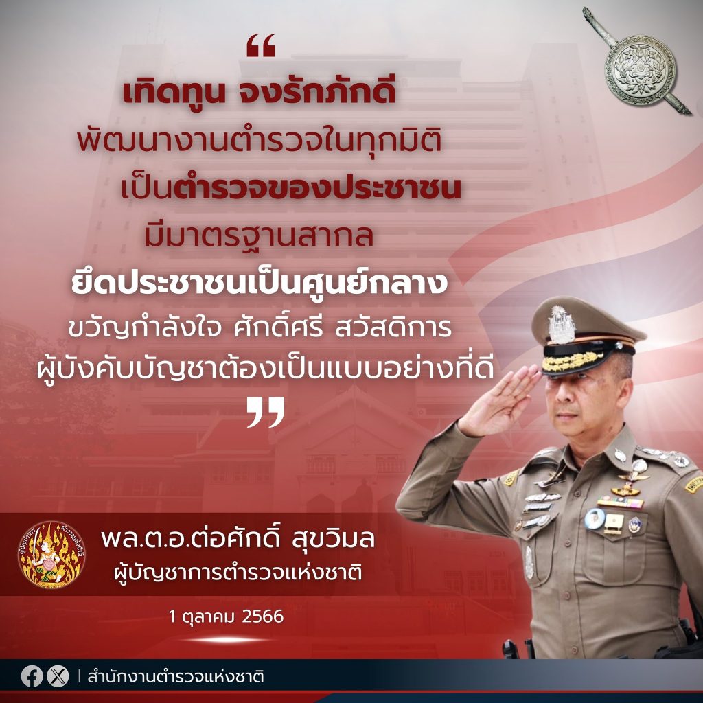 คติการทำงานของ “พล.ต.อ.ต่อศักดิ์ สุขวิมล” 11 ตุลาคม 2566 โดย admin / ข่าวประชาสัมพันธ์ “เทิดทูน จงรักภักดีพัฒนางานตำรวจในทุกมิติเป็นตำรวจของประชาชนมีมาตรฐานสากลยึดประชาชนเป็นศูนย์กลางขวัญกำลังใจ ศักดิ์ศรี สวัสดิการผู้บังคับบัญชาต้องเป็นแบบอย่างที่ดี”.คติการทำงานของ “พล.ต.อ.ต่อศักดิ์ สุขวิมล” ในฐานะผู้บัญชาการตำรวจแห่งชาติ กลับไปสู่บนสุด / Back to Top กลับไปสู่หน้าหลัก / Back to Home page Facebook iconFacebookTwitter iconTwitterLINE iconLine