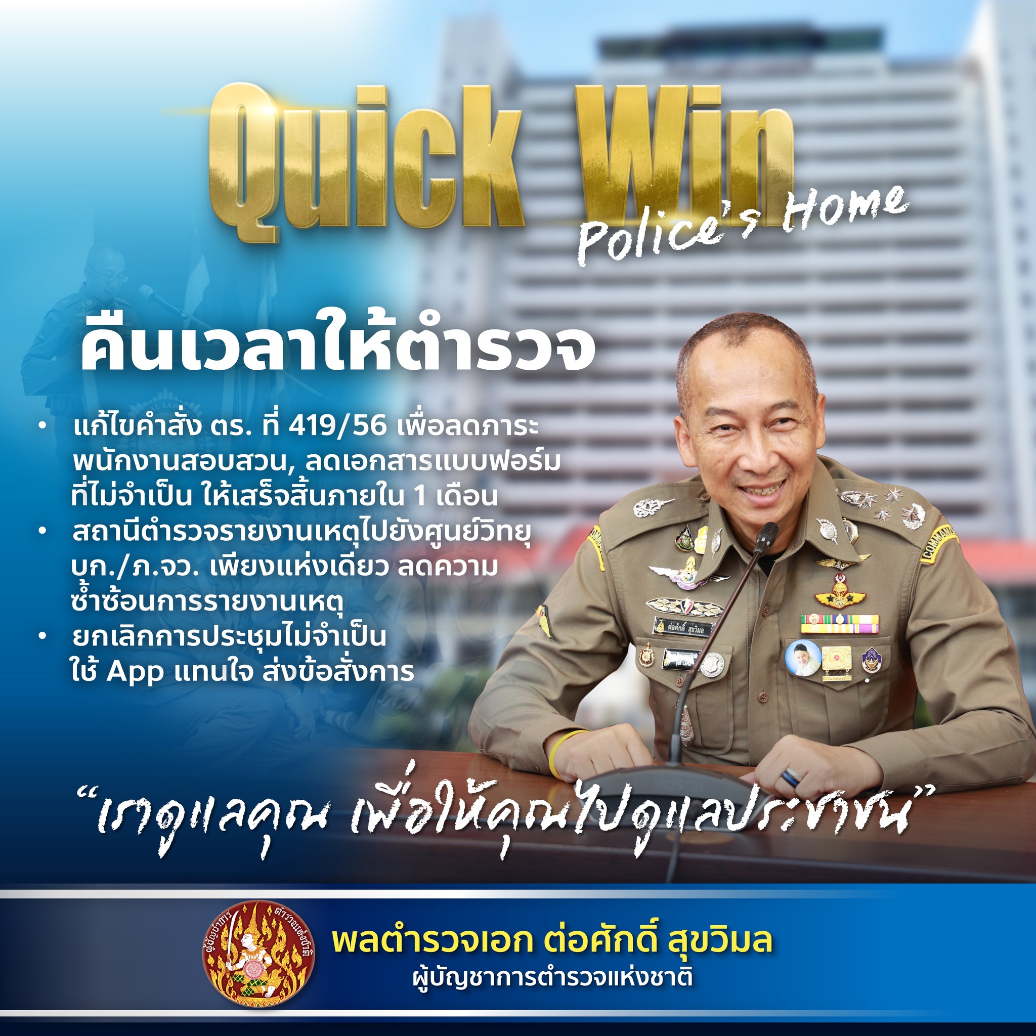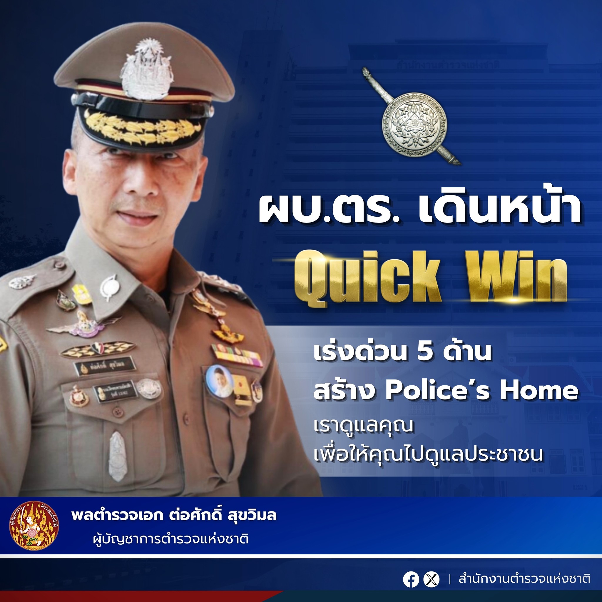 พล.ต.อ.ต่อศักดิ์ สุขวิมล ผู้บัญชาการตำรวจแห่งชาติ ( ผบ.ตร. ) มอบแนวทางการบริหารราชการสำนักงานตำรวจแห่งชาติ มุ่งมั่นพัฒนางานตำรวจทุกด้าน ยึดประชาชนเป็นศูนย์กลาง สร้างขวัญกำลังใจ ศักดิ์ศรี สวัสดิการ ผู้บังคับบัญชาต้องเป็นแบบอย่างที่ดี พร้อมกำหนด Quick Win เร่งด่วน 5 ด้าน สร้าง Police’s Home ดูแลตำรวจ เพื่อให้ตำรวจไปดูแลประชาชน