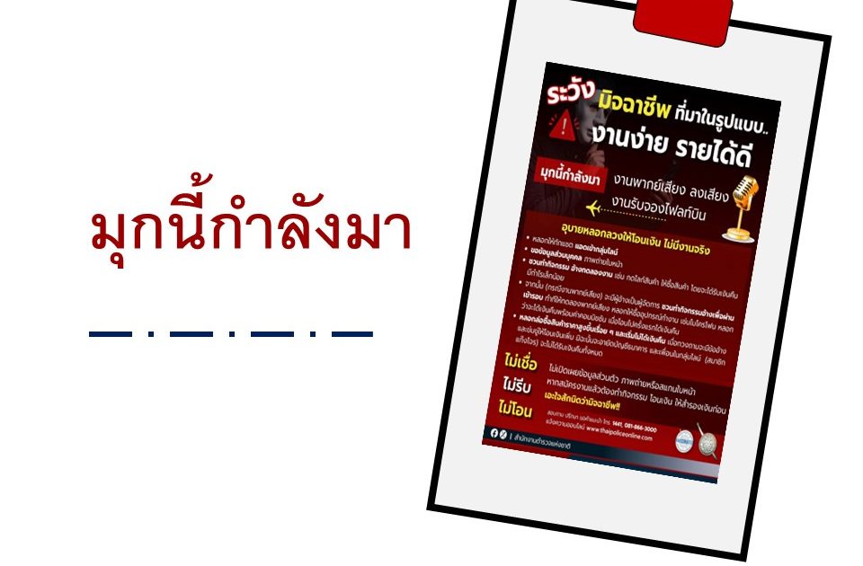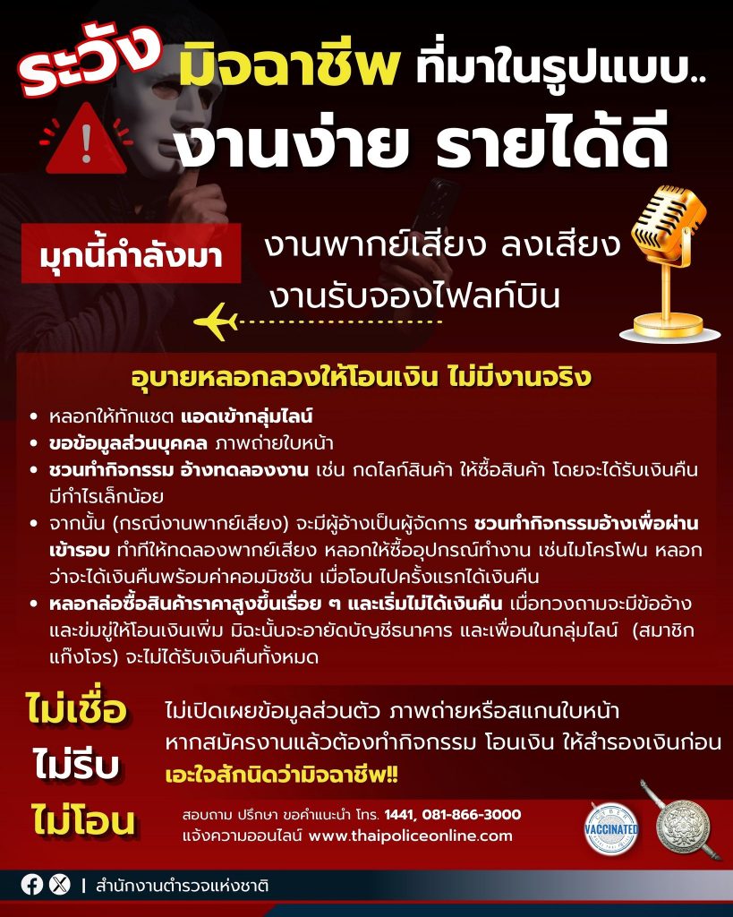 สำนักงานตำรวจแห่งชาติเตือนภัยออนไลน์ อุบายเดิม ๆ แต่มุกใหม่ ชวนทำงาน “พากย์เสียง ลงเสียง” “รับจองไฟลท์บิน” ล่อใจด้วยรายได้สูง