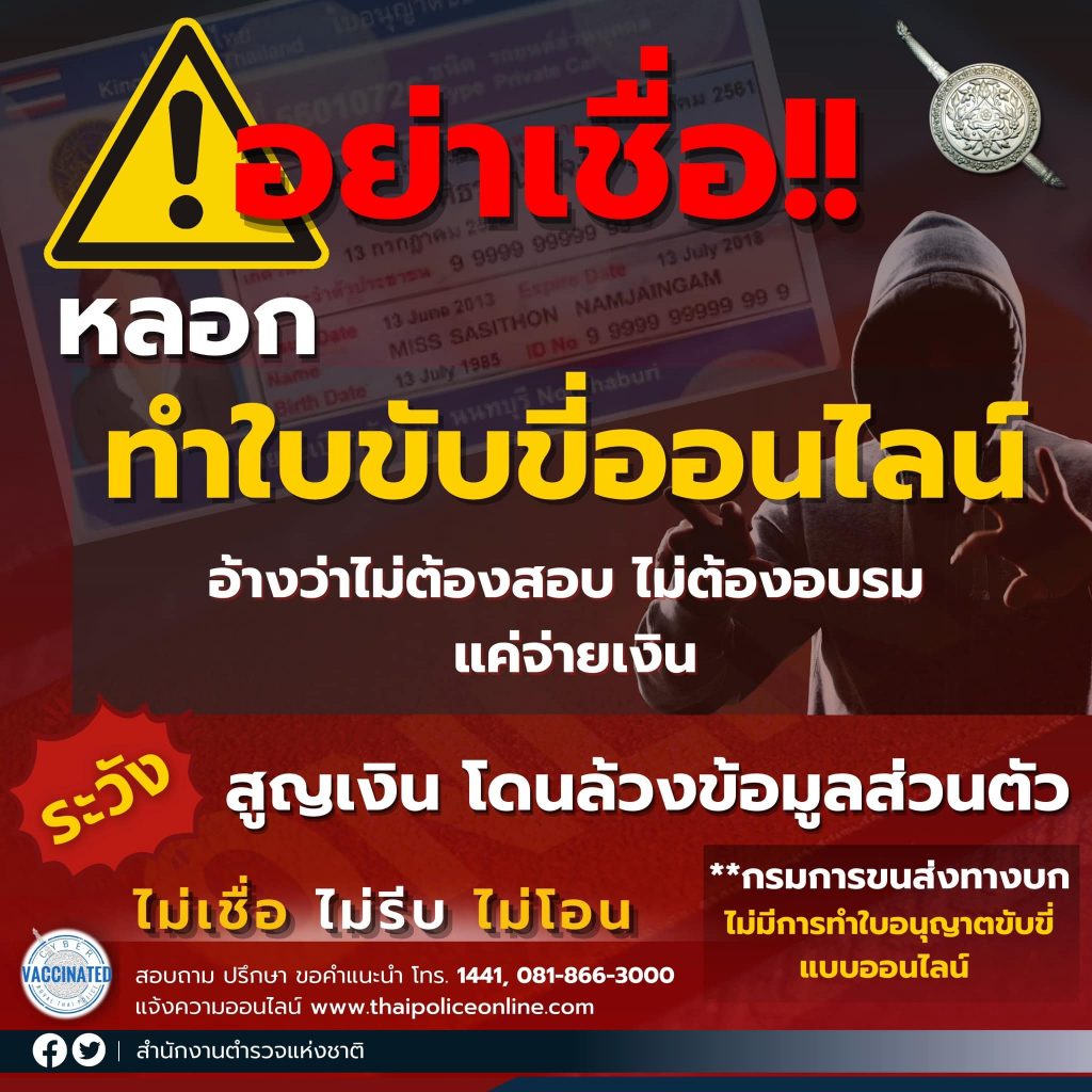หลอกทำใบขับขี่ออนไลน์ !!! 3 สิงหาคม 2566 โดย admin / 18 กลโกง ของมิจฉาชีพ ที่ใช้ในการหลอกเหยื่อ บนโลกออนไลน์ ระวังมิจฉาชีพ !!! หลอกทำใบขับขี่ออนไลน์ ในรูปแบบต่าง ๆ อาทิเช่น ทำโดยไม่ต้องไปสำนักงานขนส่ง เป็นต้น ด้วยความห่วงใยจากตำรวจภูธรบ้านในหูต ติดต่อสอบถาม โทรศัพท์ 077 595 135 กลับไปสู่บนสุด / Back to Top กลับไปสู่หน้าหลัก / Back to Home page Facebook iconFacebookTwitter iconTwitterLINE iconLine