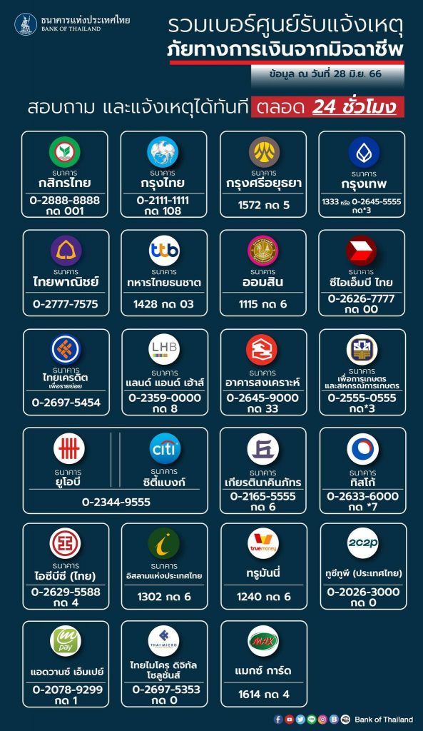อัพเดท เบอร์ศูนย์รับแจ้งภัยทางการเงินจากมิจฉาชีพ ของธนาคาร