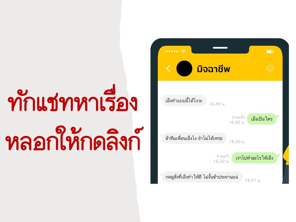 ระวังมิจฉาชีพ !!!! ทักแชทหาเรื่อง แล้วหลอกให้กดลิงก์ ด้วยความห่วงใยจากตำรวจภูธรบ้านในหูต ติดต่อสอบถา