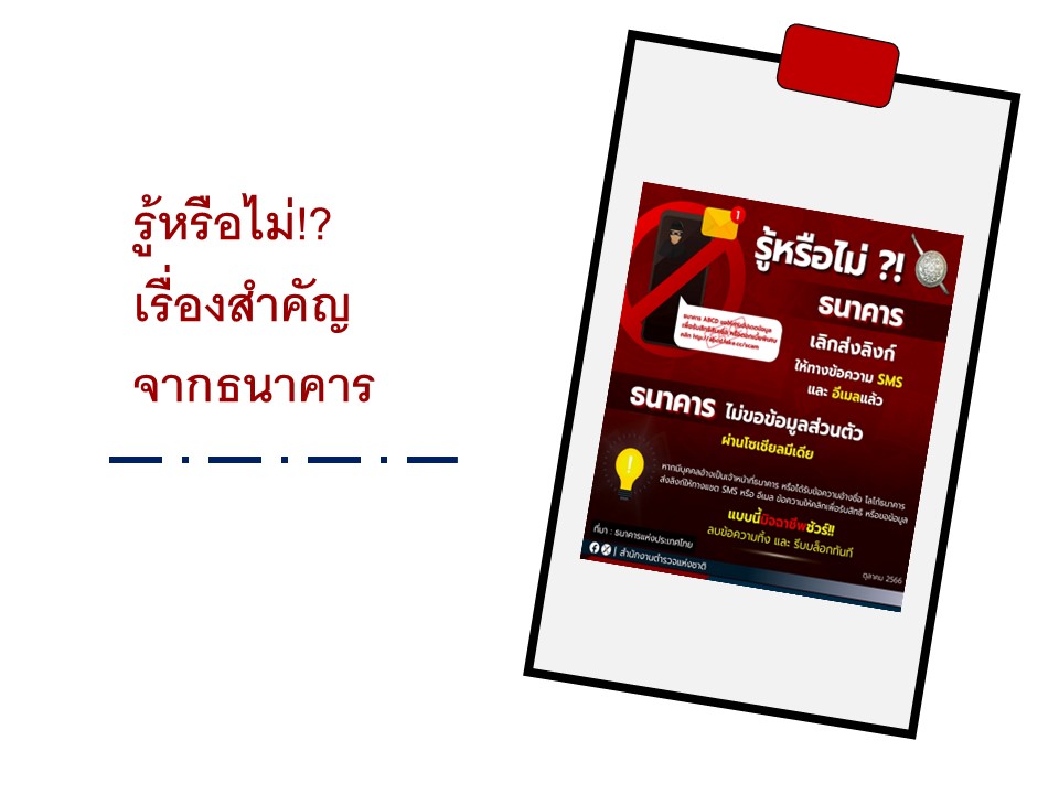เรื่องสำคัญจากธนาคาร1. ธนาคารเลิกส่งลิงก์ให้ทางข้อความ SMS และอีเมลแล้ว2. ธนาคารไม่ขอข้อมูลส่วนตัวผ่