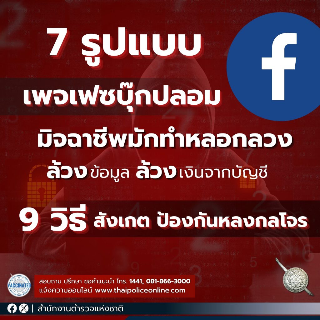 7 รูปแบบ “เพจเฟซบุ๊กปลอม” ที่มิจฉาชีพมักทำมาหลอกลวงประชาชน เพื่อล้วงข้อมูล ล้วงเงินจากบัญชี พร้อม 9 วิธีสังเกต ป้องกัน มิให้หลงกลโจรออนไลน์