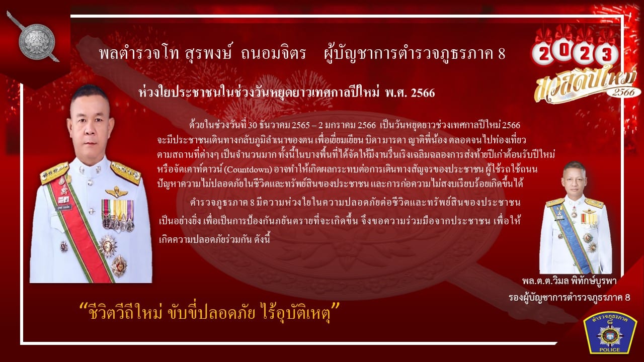 สาสน์ ผบช.ภ.8 ห่วงใยประชาชนช่วงวันหยุดยาวปีใหม่ พ.ศ.2566