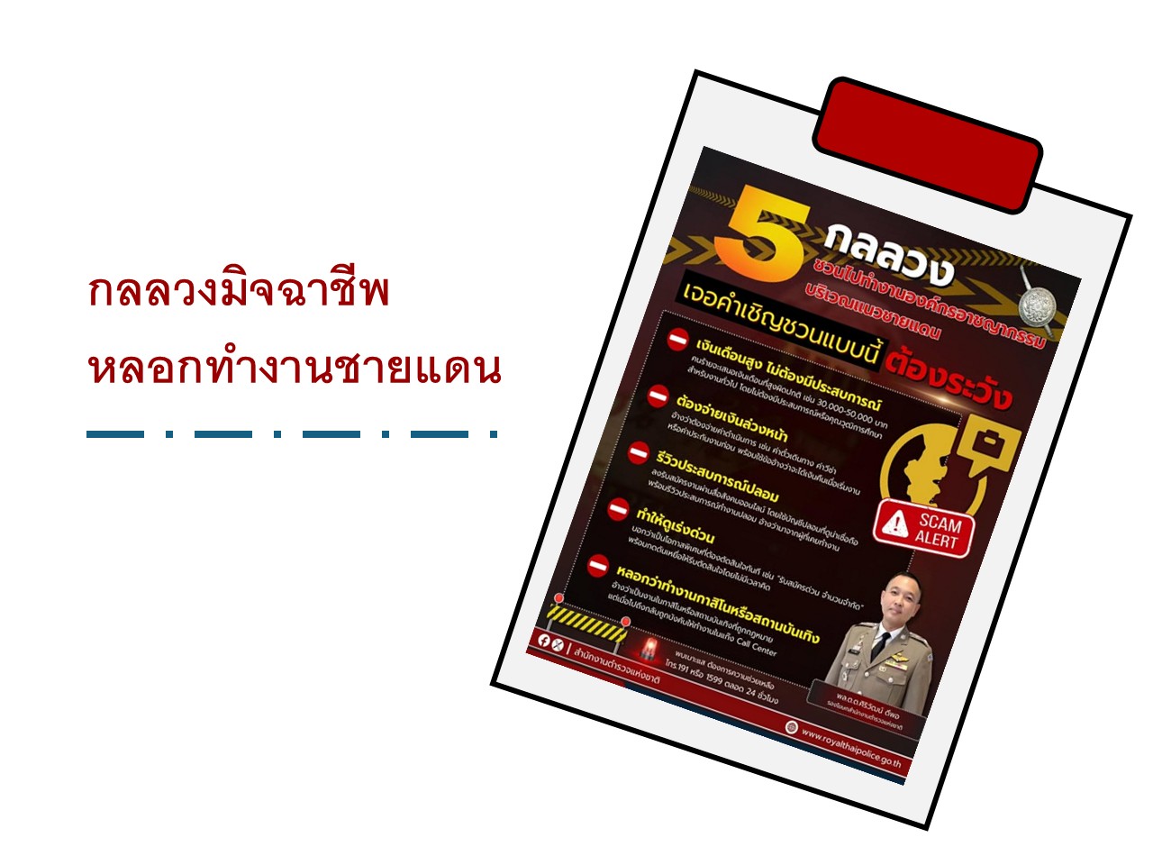 ตีแผ่ 5 กลลวงมิจฉาชีพ หลอกทำงานชายแดน สุดท้ายตกเป็นเหยื่อค้ามนุษย์ . พล.ต.ต.ศิริวัฒน์ ดีพอ รองโฆษกสำ